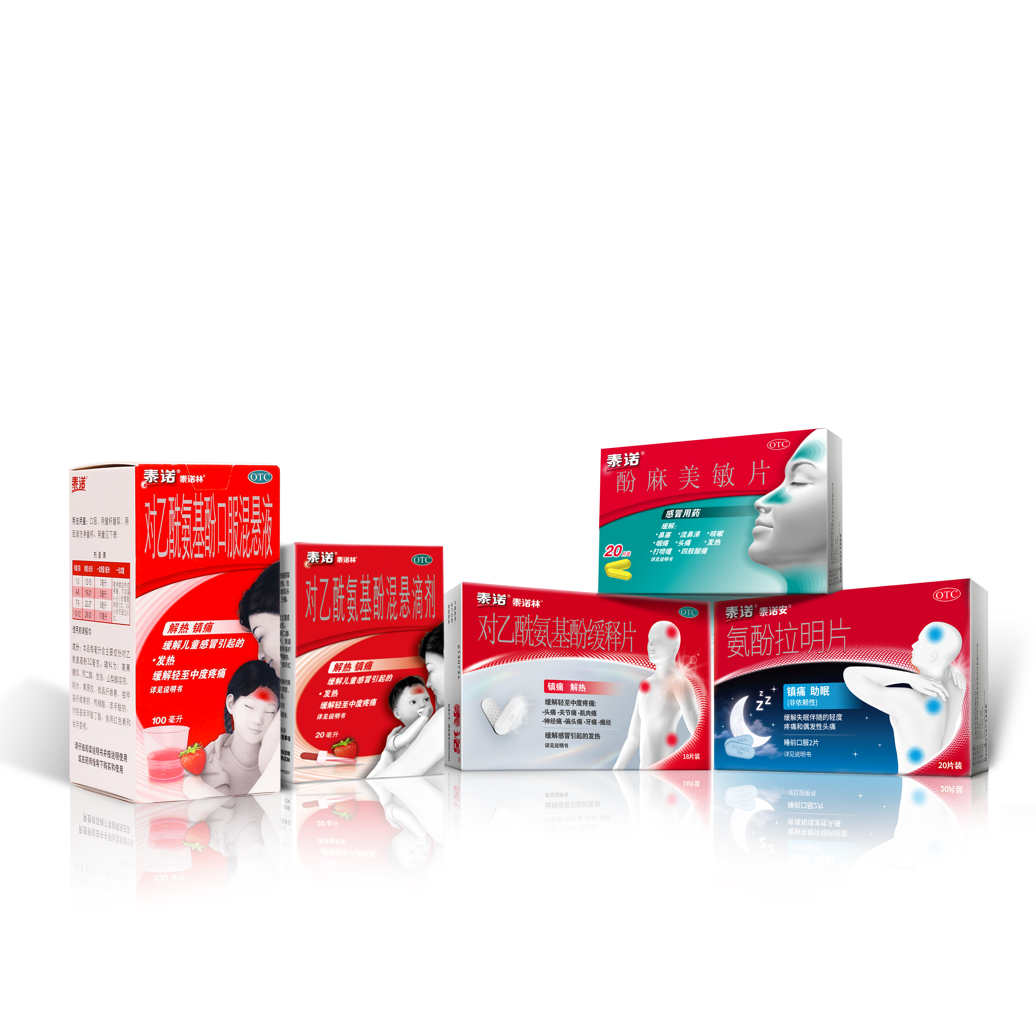 旗下产品包括成人感冒(泰诺®酚麻美敏片)、成人镇痛(泰诺林®对乙酰氨基酚缓释片)、夜间镇痛(泰诺安®氨酚拉明片)、儿童退热(泰诺林®对乙酰氨基酚混悬滴剂/口服混悬液)。泰诺®含有有效成分对乙酰氨基酚,常见于解热镇痛和感冒药等药物。